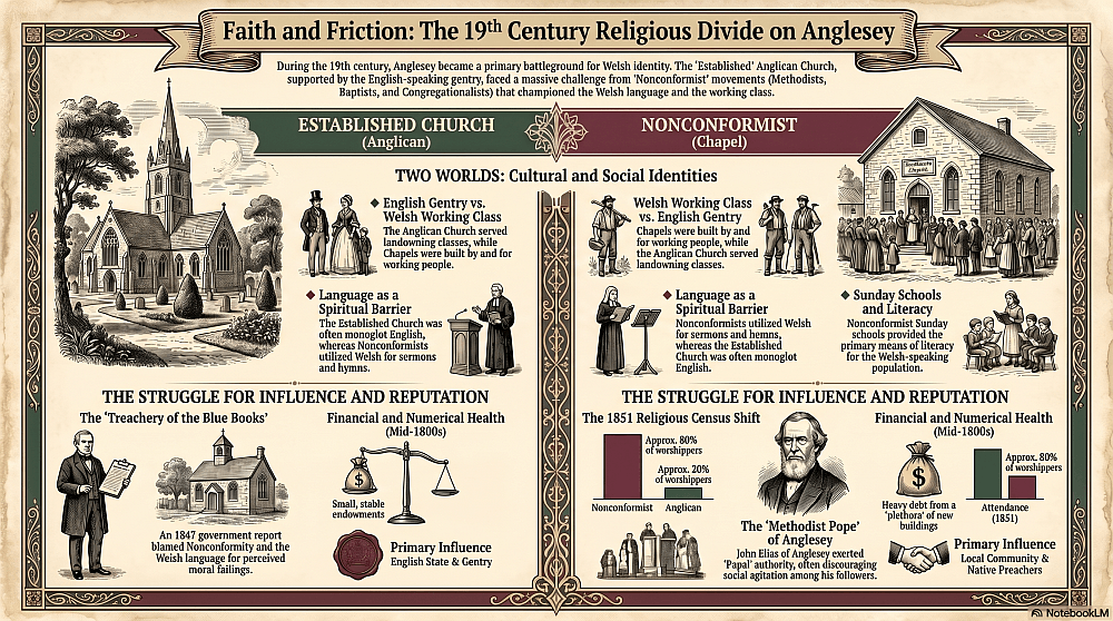Gwalchmai has maintained a resilient community identity, with 75% of the population recorded as Welsh speakers in the 2001 Census. The 18th and 19th centuries saw a rise in Non-conformity, leading to the construction of rival chapels: