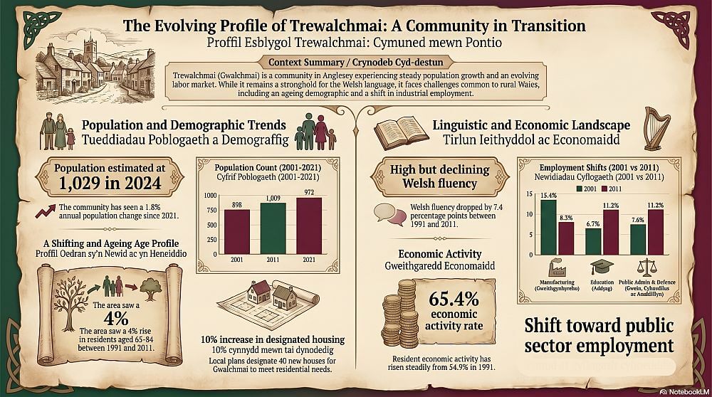 - Welsh Language: In 2011, 67.8% of the ward was fluent in Welsh. While a stronghold, this represented a decline of 7.4 percentage points since 1991.